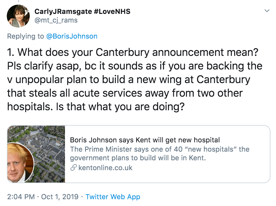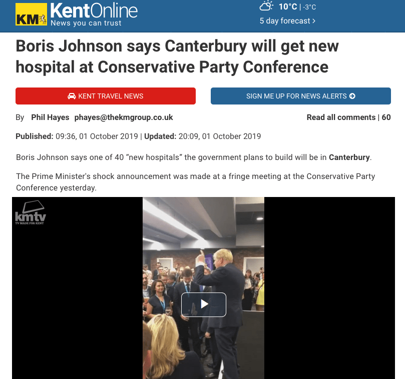 Anna Firth ultimately had to row back on the announcement made by Johnson after local NHS bosses publicly disowned the claim. She said it was ‘clearly a mistake’. Boris Johnson himself never confirmed or denied this. It was left hanging in the air – in the month before the general election. Conveniently it allowed Canterbury Conservatives to capitalise on the impression that the PM had promised a shiny new hospital, while Tory voters in Thanet and Ashford could be reassured that it was just ‘a mistake’.