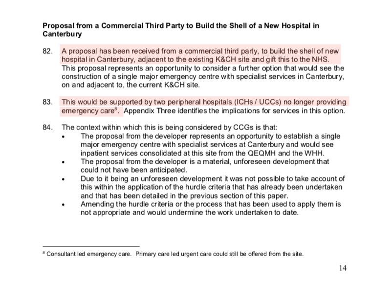 The story goes like this. Peggy Pryor bumped into Mark Quinn entirely by chance in a Canterbury pub and she urged him to approach East Kent NHS Trust with a proposal to build a ‘new’ hospital in Canterbury. On receiving this proposal, the decision-makers were compelled to add a second option to their existing plans which followed his offer to the letter. It comprises Quinn providing the ‘shell’ of a new hospital building in Canterbury in exchange for permission to build 2,000 homes on adjacent land. It also spells out the demise of two nearby A&Es in the district hospitals of Margate (Thanet) and Ashford. This chance meeting may sound like a shaggy dog story, but it has been repeated in news articles, and the fact that it was Quinn who approached the trust and not the other way around has been confirmed in NHS documents.