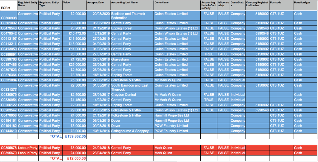 The data from the Electoral Commission shows two donations made by Quinn to the Labour party as well as the twenty-one accepted by the Conservatives. The overall figure is far smaller. Whenever Quinn is challenged about his copious donations to the party that runs almost all local councils in Kent, and his simultaneous ability to get tricky and controversial building projects rubber-stamped, he tends to comment that he’s donated to Labour too. It’s a good deflection. How short-sighted of Labour nationally to have accepted these donations that simply serve to take the heat off businessmen like Quinn.