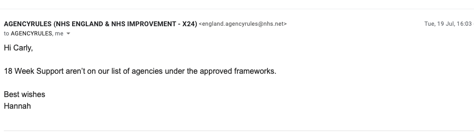 Edit: I contacted NHSE about 18 Week Support Ltd to check if they were on the approved list for insourced support. They are not. 21.07.22.