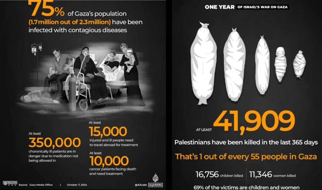 5) Al Jazeera’s One Year of Israel’s War on Gaza focusses on the numbers, including: 41,909 Palestinians killed; 97,303 injured; more than 10,000 missing or accounted for; 114 hospitals or clinics rendered inoperative; 75% of Gaza’s population infected with contagious diseases; 96% facing a lack of food; 700 water wells destroyed, and over 10,000 Palestinians held in Israeli prisons in dangerous conditions, with 3,332 of those being held under administrative detention, i.e., without charge or trial.