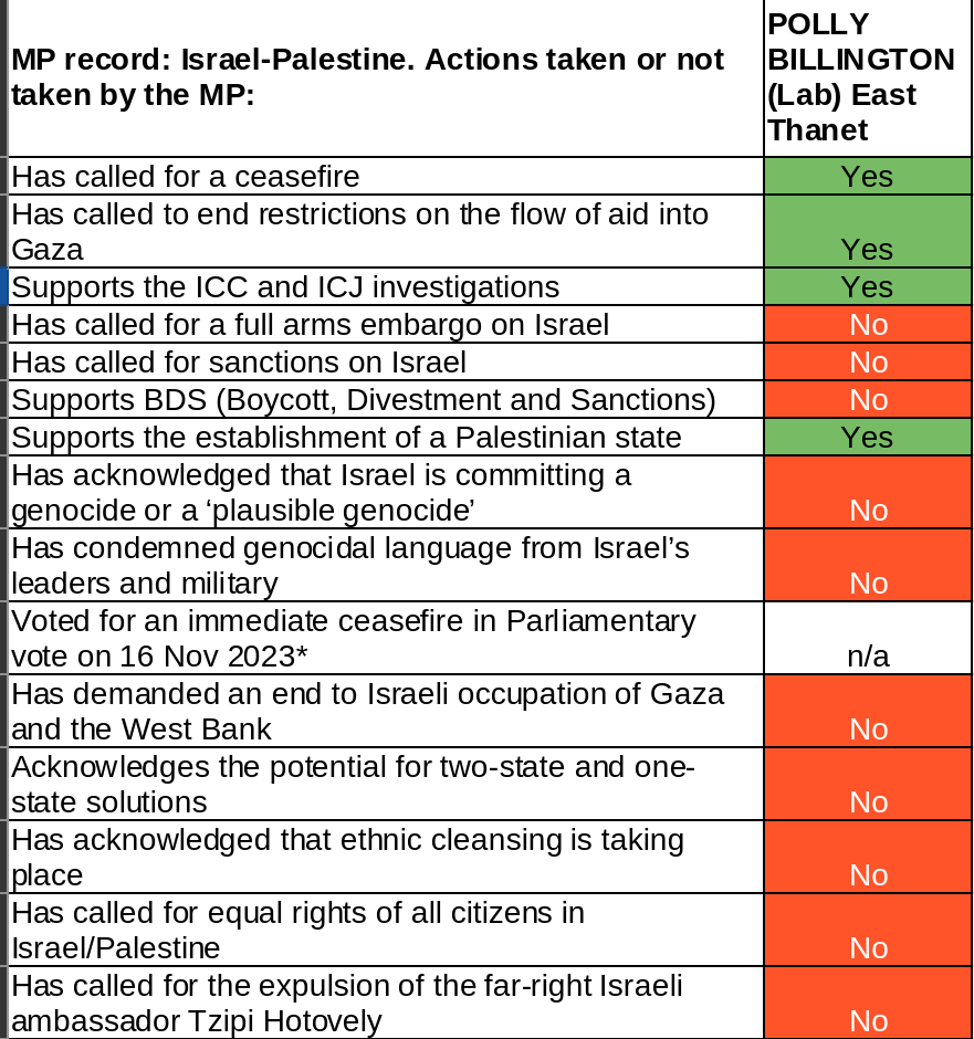 | MP Scorecard, Palestine. Actions taken or not taken by the MP: | Polly Billington (Lab) East Thanet |